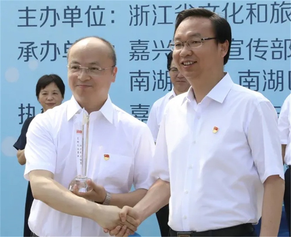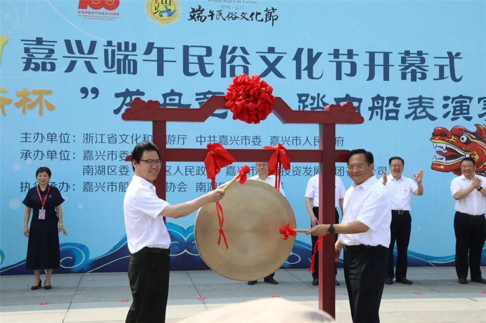 市委書記張兵(右)與省文化和旅游廳副廳長葉菁(左)為2021嘉興端午民俗文化節鳴鑼開幕