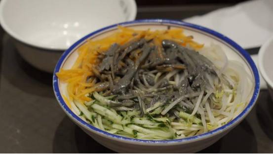 飲食文化也依時令隱含其中。民諺曰:“吃過夏至面,一天短一線。”夏至吃面是很多地區的習俗。因夏至新麥已經登場,所以夏至吃面也有嘗新的意思。除此之外,夏至吃糕團也寓意著節節高升以及平安健康。美食鑒賞家樊老師帶領徐老師品嘗了南門頭的特色美食——夏至面以及糕團。