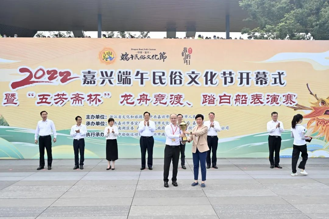 6月2日上午,由浙江省文化和旅游廳、中共嘉興市委、嘉興市人民政府共同主辦的2022嘉興端午民俗文化節開幕式暨“五芳齋杯”南湖龍舟競渡、踏白船表演賽,在嘉興西南湖火熱開場。